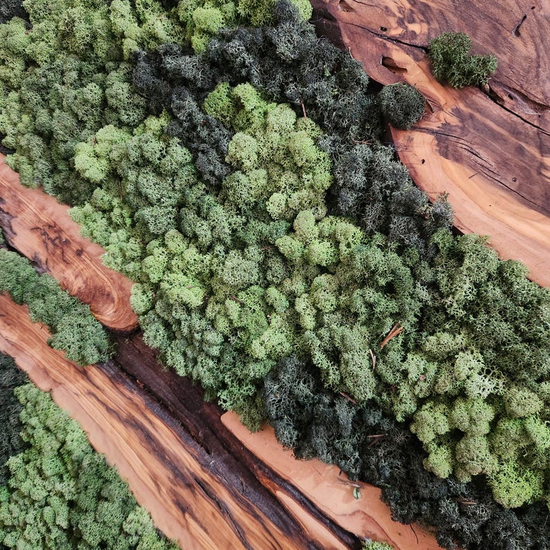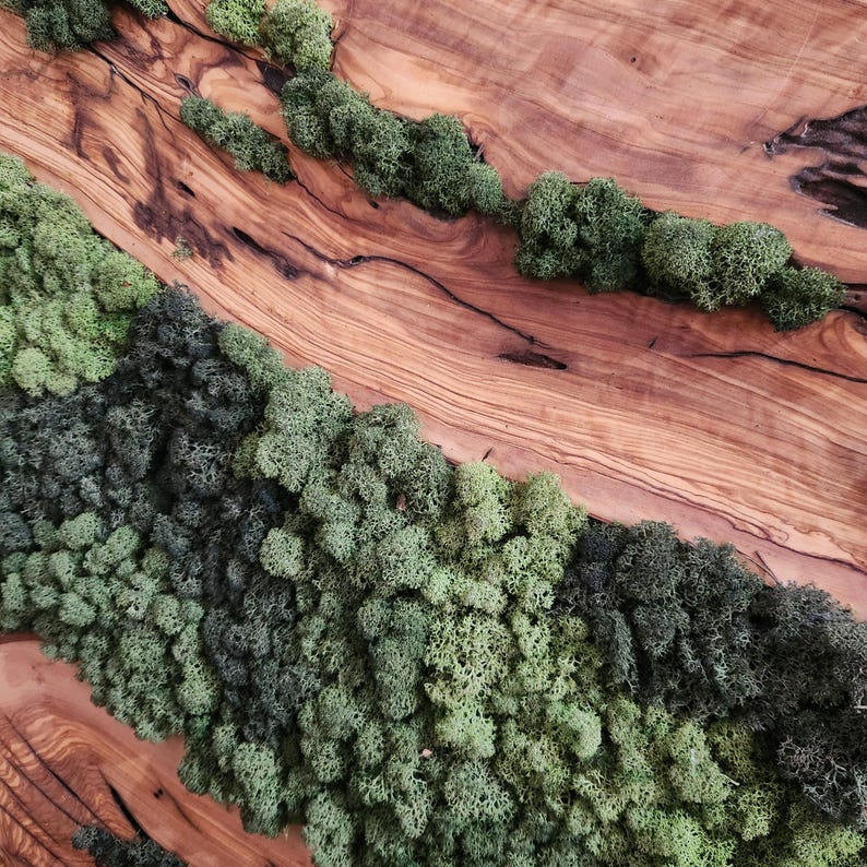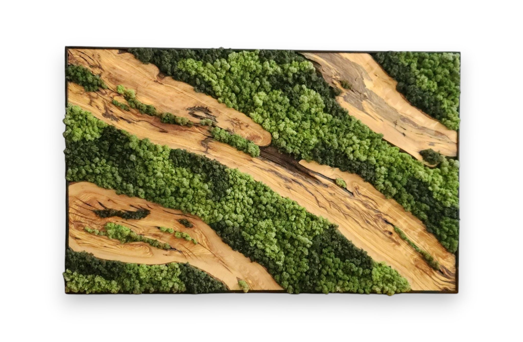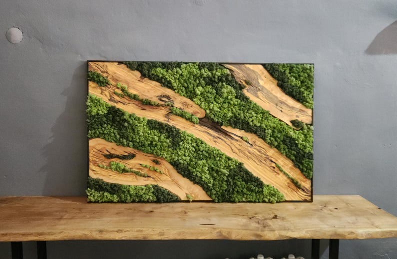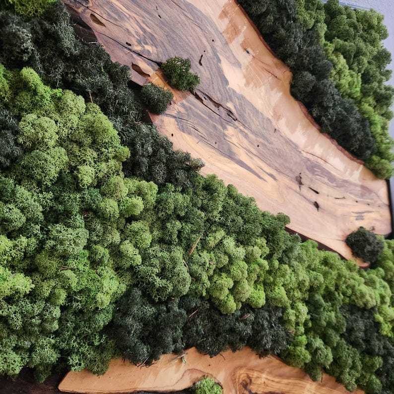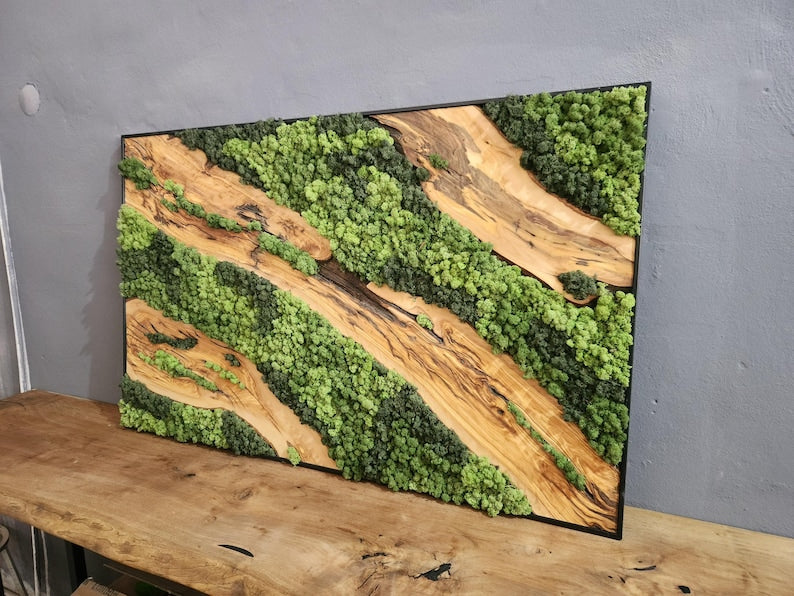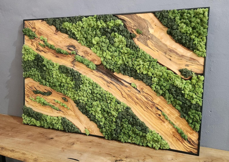 Each artwork is one of a kind, with the organic shapes and textures of the wood making every piece unique. The rich tones of olive wood contrast beautifully with the soft, lush greenery of the moss, adding depth and character to any space.