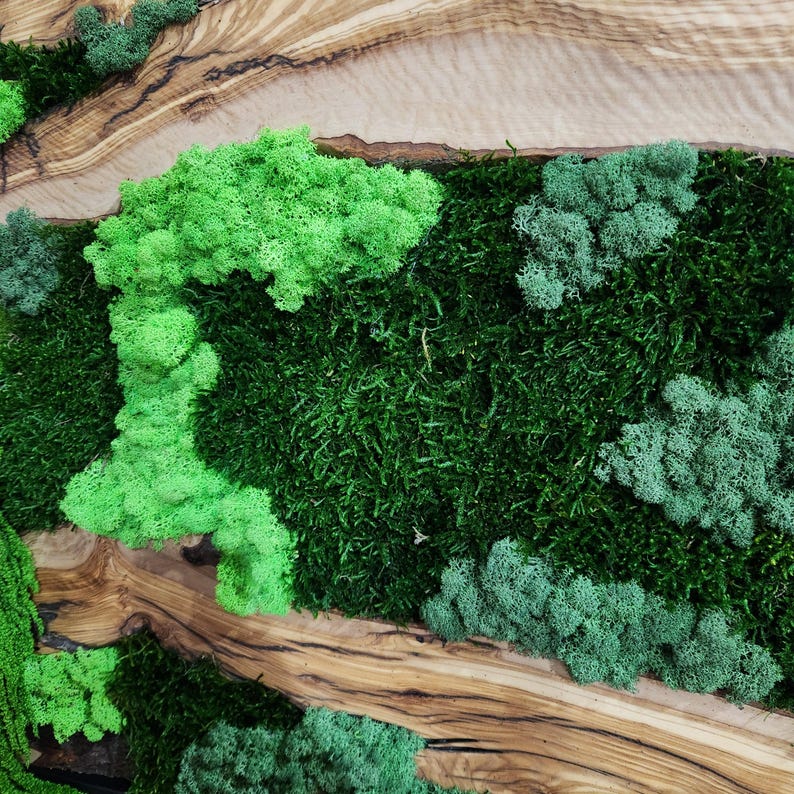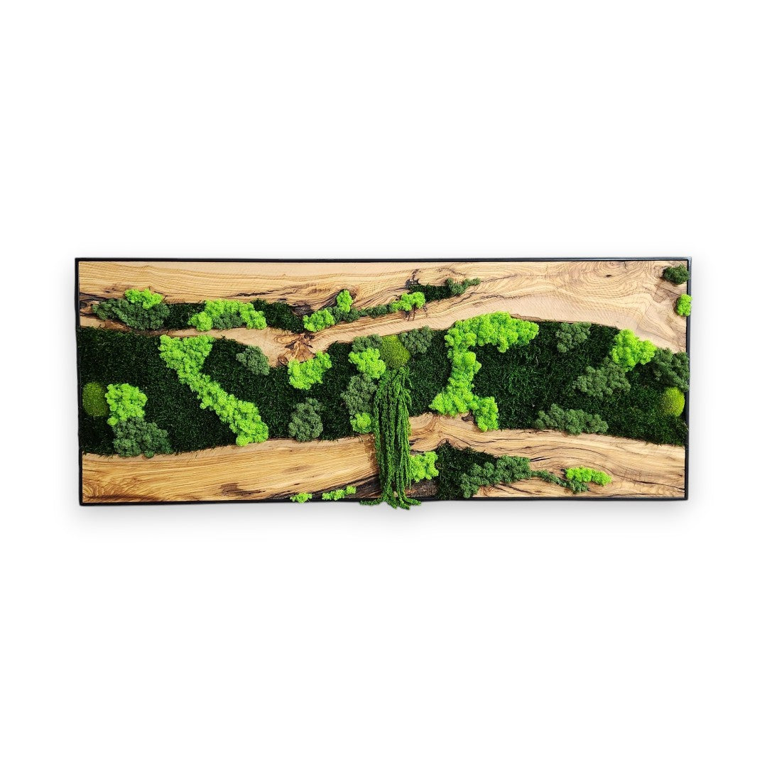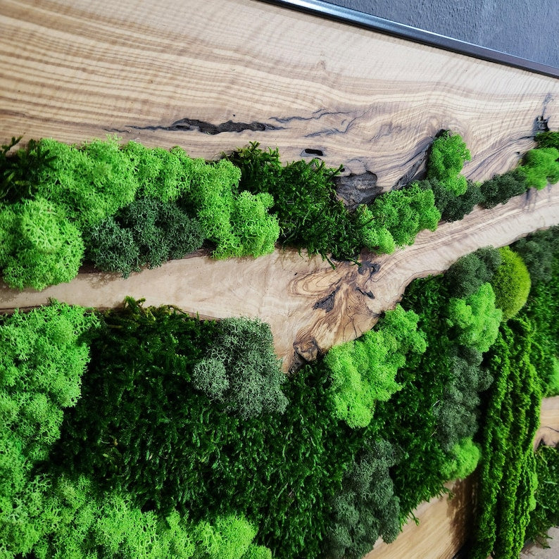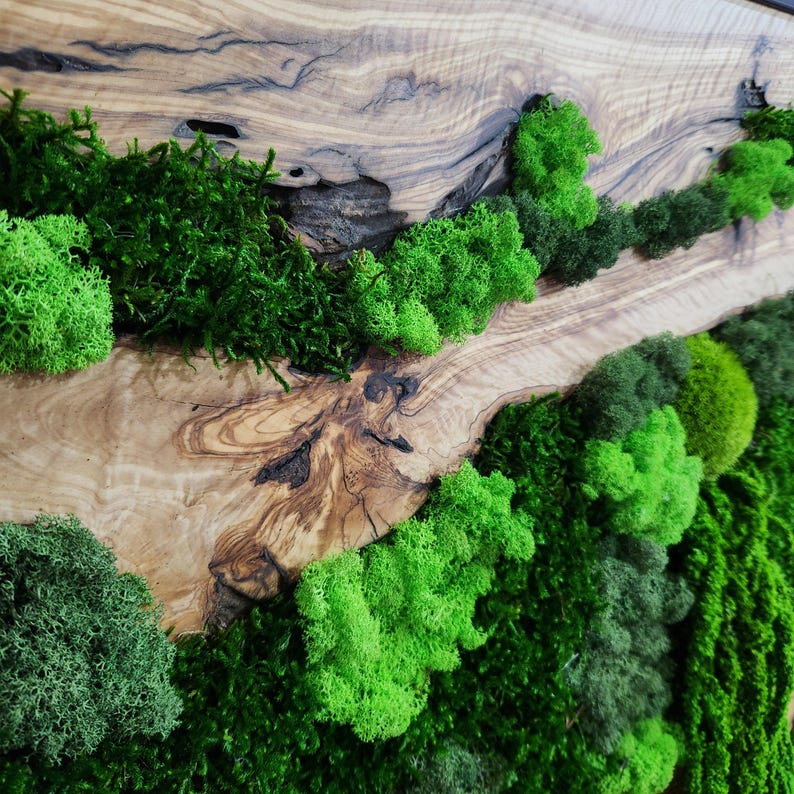 Each artwork is one of a kind, with the organic shapes and textures of the wood making every piece unique. The rich tones of olive wood contrast beautifully with the soft, lush greenery of the moss, adding depth and character to any space.