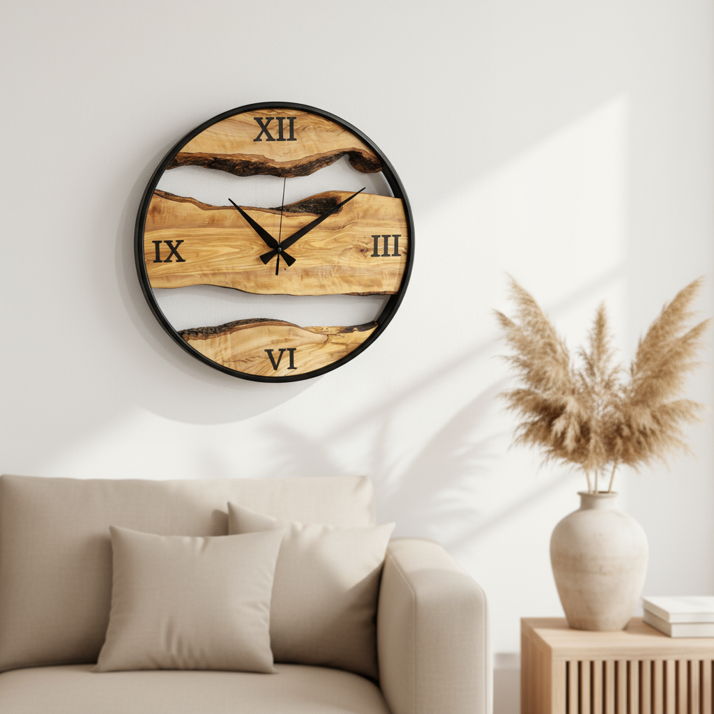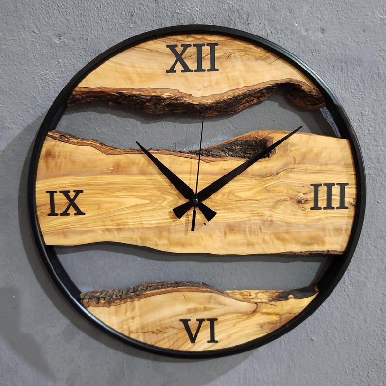 Olive Wood Wall Clock with Metal Ring & Epoxy Roman Numerals